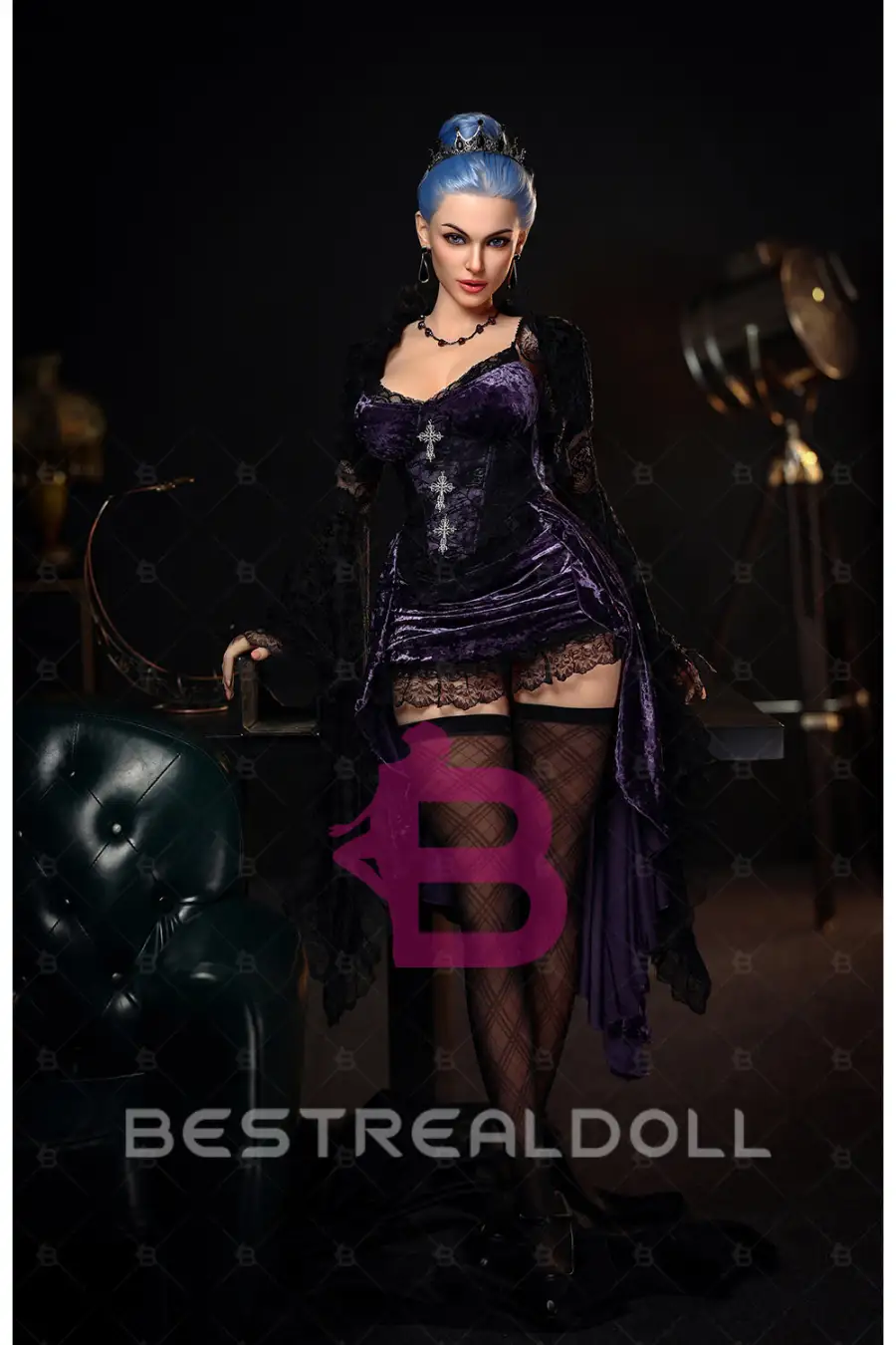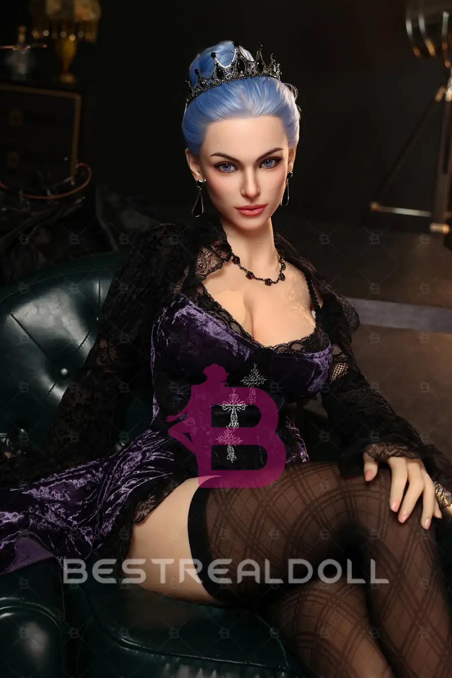 1. Jovie is a lifelike doll with blue hair and an attractive face. She is dressed in a stylish, elegant outfit designed to enhance your intimate experiences.